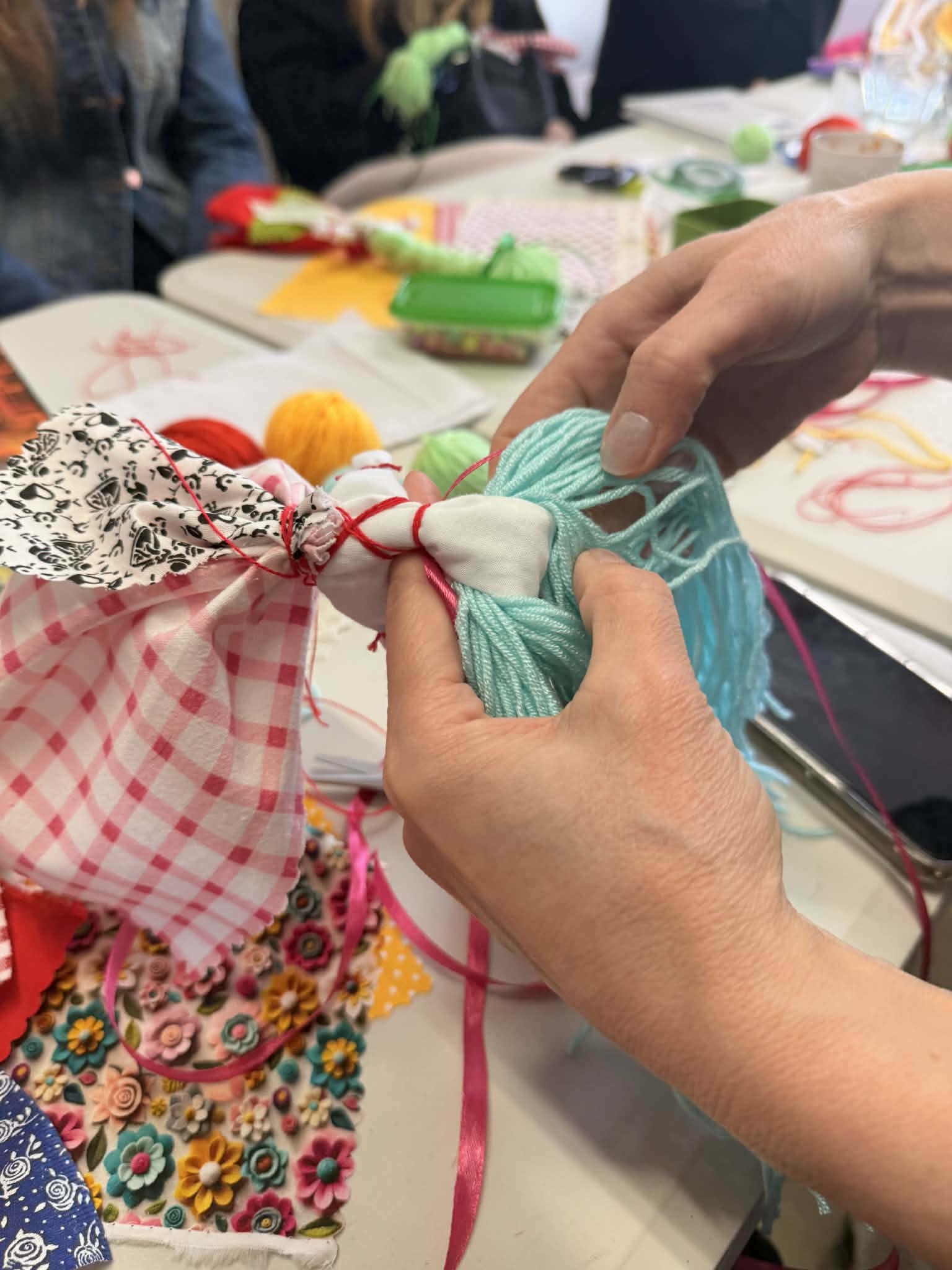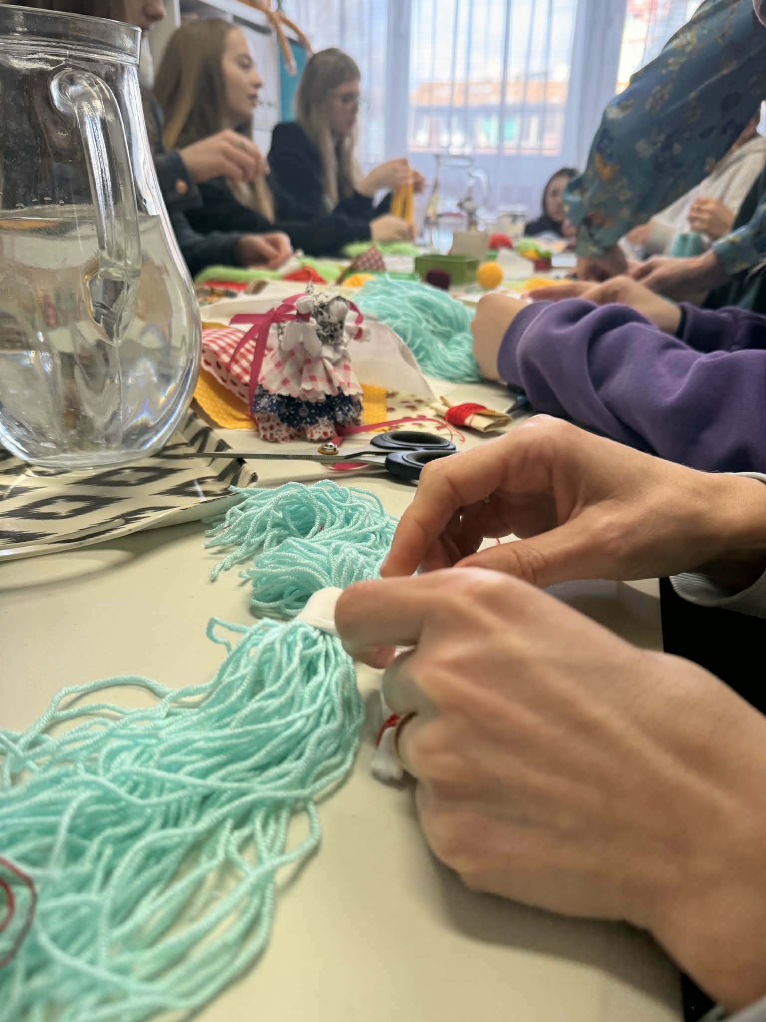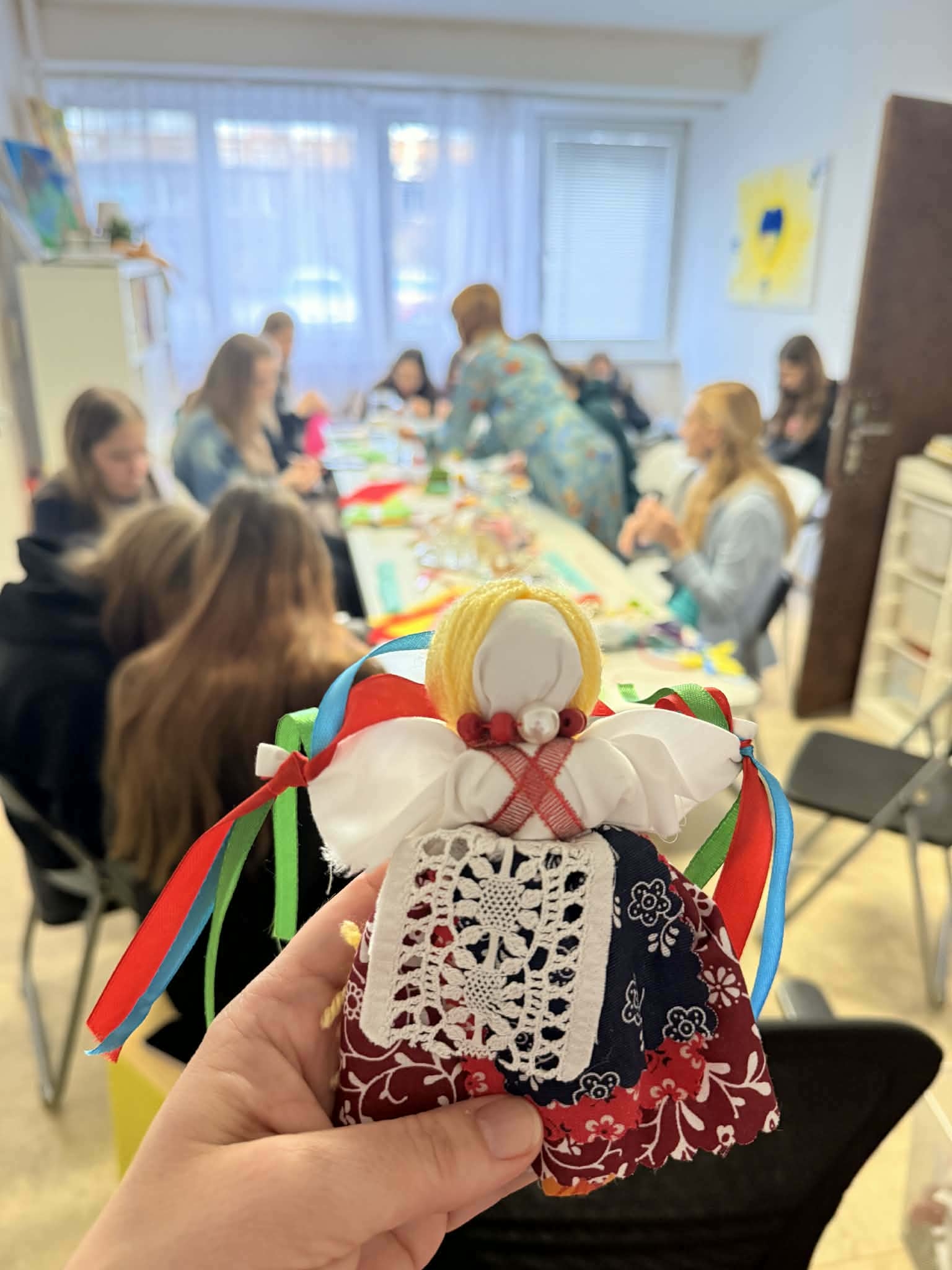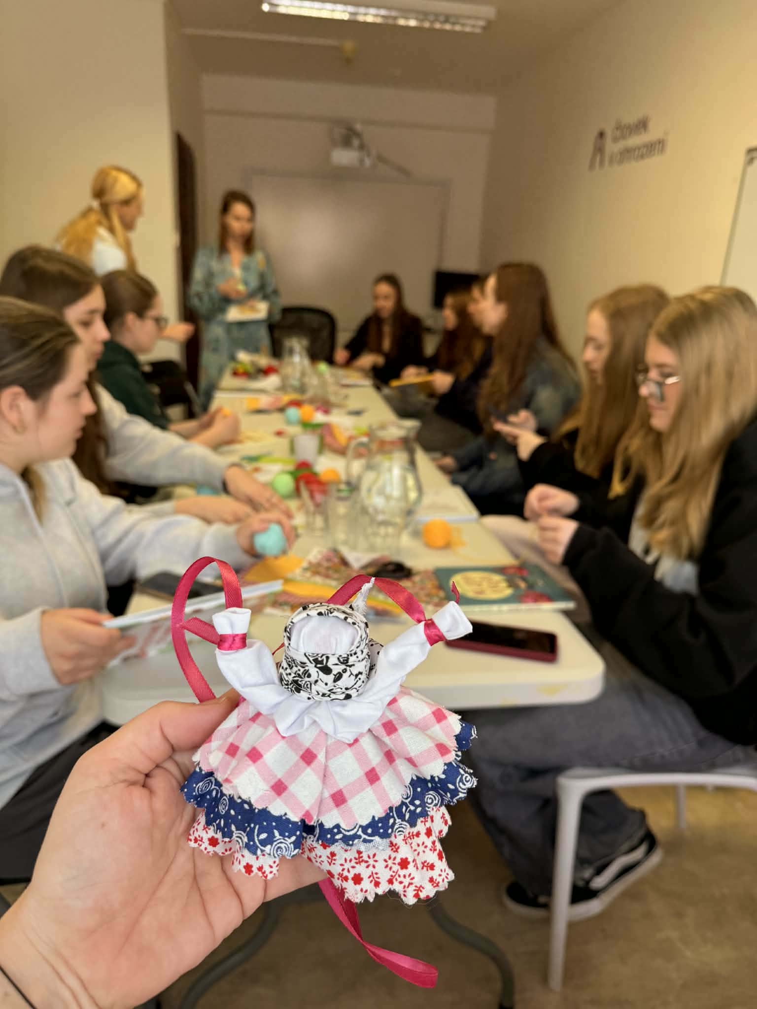 Po prestávke sme sa presunuli do Klubovne organizácie – Človek v ohrození, ktorá je nezávislá, neutrálna a nestranná mimovládna organizácia a venuje sa pomoci ľuďom zasiahnutým krízami doma aj vo svete. Tu sme si vyskúšali vyrobiť tradičnú ukrajinskú motanku – bábiku, ktorá symbolizuje ženskú silu a odvahu. Každá z nich vytvorila originálny výrobok, do ktorého vložila kus seba.